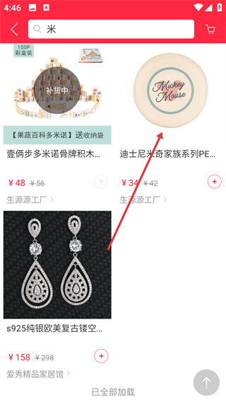 3、在搜索结果页面找到并点击【迪士尼米奇家族系列PE飞盘】这款商品,即可进入该商品的详情页面。