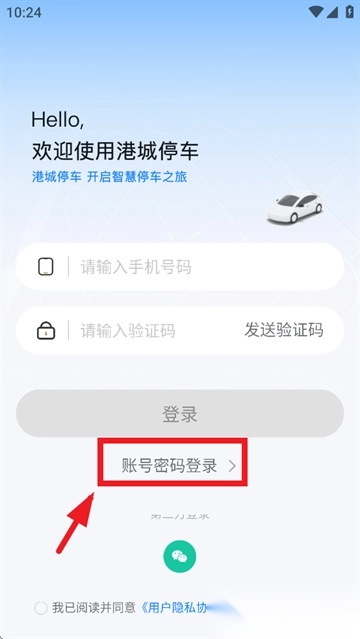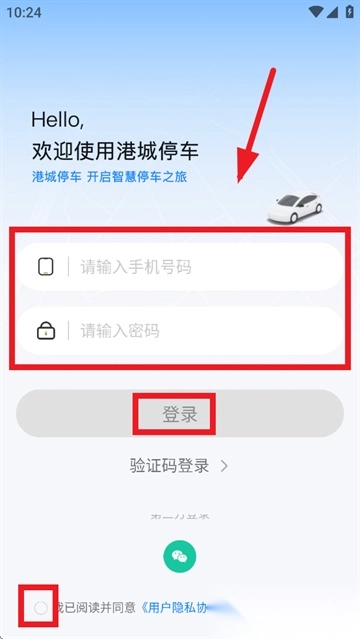 输入注册手机号和密码,勾选用户协议后完成登录;