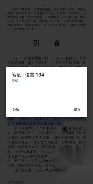2、找到你喜欢看的书籍打开,长按选中你需要添加笔记的文字,点击顶部的笔记按钮;