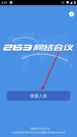 1、打开【263网络会议】的启动页面,点击【快速入会】按钮,即可进入会议加入的信息填写界面。