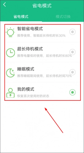 2、在【模式】页面,点击【省电模式】;即为手动设置:用户可根据自己电量情况,设置适合当前情况的省电模式。