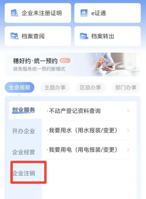 2、在企业办事页面点击【企业注销】