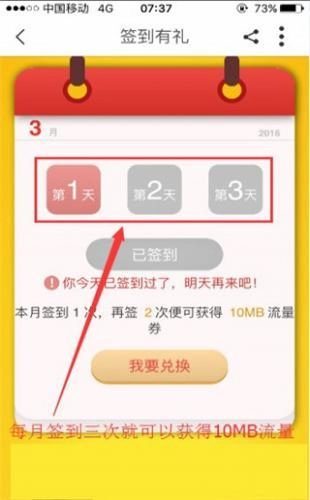 3、若我们在一个月内完成三次成功签到,即可获得10MB的流量兑换券。之后依旧在“签到有礼”页面,点击“我要兑换”功能键就能进行流量兑换。