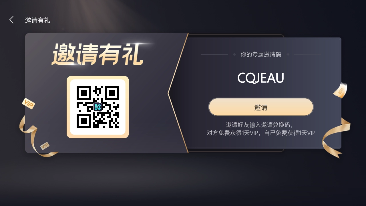 ②打开后就能获取兑换码,兑换码的获取规则是邀请好友输入邀请兑换码,对方可获得1天VIP,自己也能获得1天VIP。小编在此附上自己的邀请码CQJEAU,有需要体验会员的朋友可以试试,各位小伙伴也可以和朋友们互相帮忙哦。