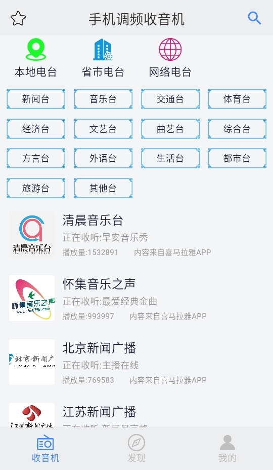 手机调频收音机是一款FM广播收听工具,无需耳机即可实现流畅清晰的播放体验,拥有海量国内电台资源,涵盖音乐、新闻等多种分类,还整合了小说、相声、英语等音频内容,搭配专线不间断直播服务,让您随时获取内容。其界面设计简洁,打开后无需额外设置,点击即可开始收听。