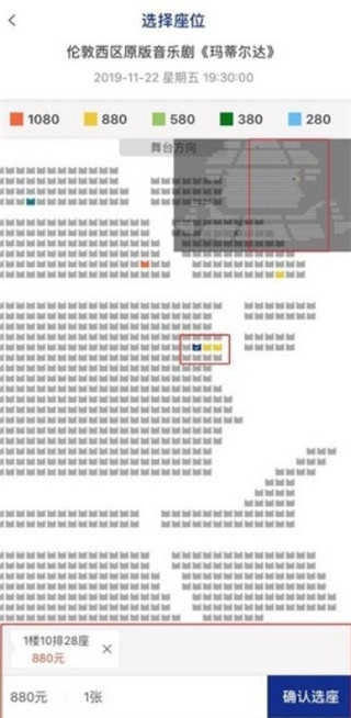 2、确定好演出时间后,点击“选座购买”按钮进入座位选择界面,选好座位后再点击“确认选座”,即可进入订单确认页面。