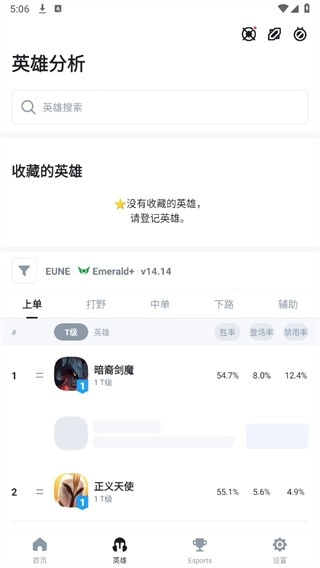 4、进入英雄板块,搜索自己钟爱的英雄并添加至收藏,查看该英雄在高分段的胜率情况。