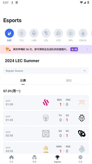 5、此外,通过比赛栏目还能查看LEC、TCL、LMS、LCL、LCO、OPL、CBLOL等不同赛事的战绩。