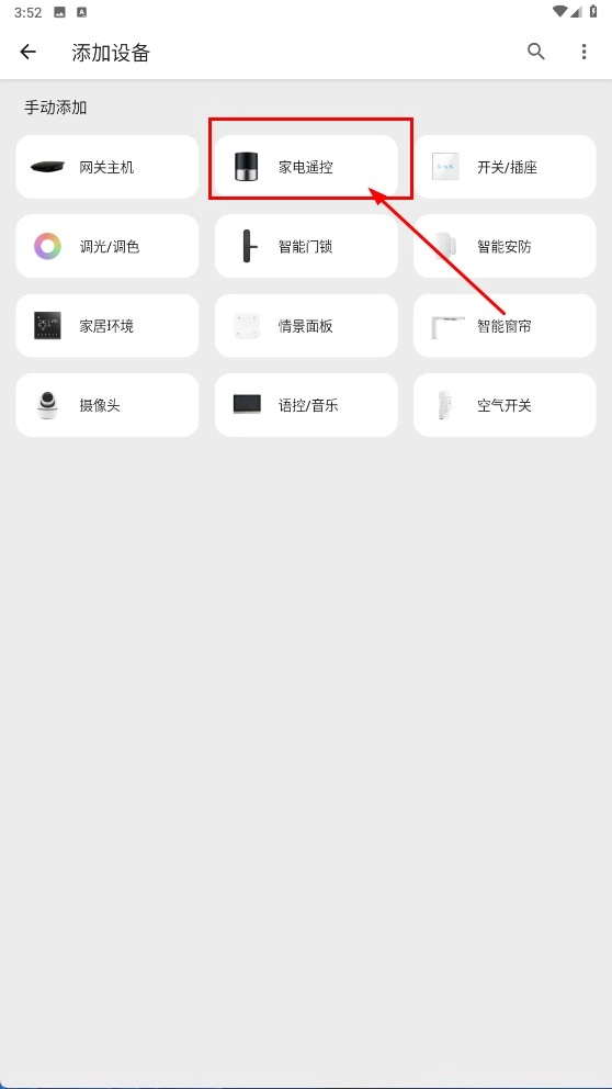 在添加设备列表中,选择【家电遥控】类别,即可进入对应的设备选择界面。