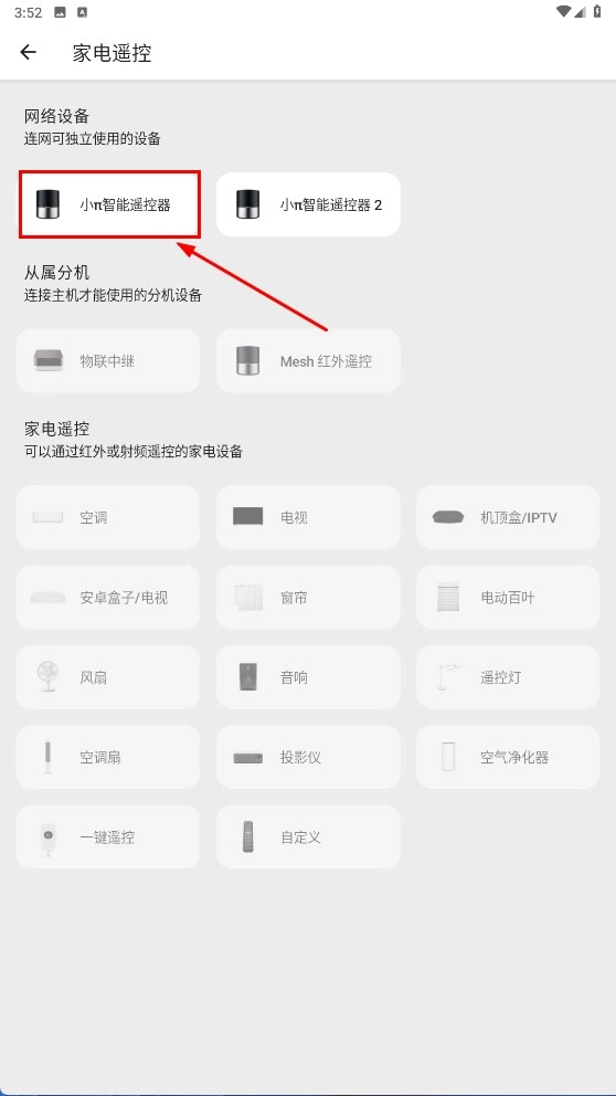在【家电遥控】界面,找到并点击【小π智能遥控器】选项,即可启动该设备的配置流程。