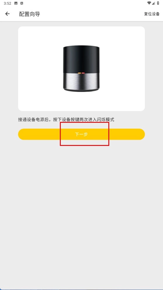 先给设备接通电源,接着按两下设备按键进入闪烁模式,之后点击【下一步】,再继续完成WiFi连接就可以了。