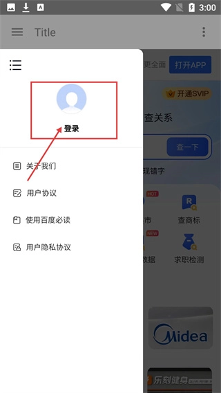 展开菜单后,选择【登录】选项即可进入登录流程,完成登录后您将能体验到更全面的功能;此外,菜单里还设有关于我们、用户协议等相关内容。