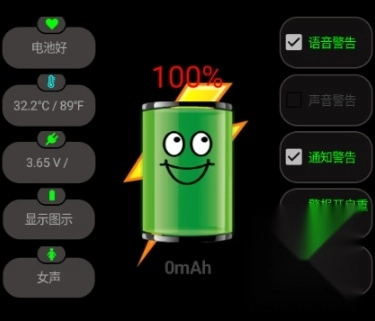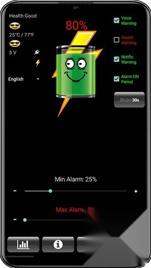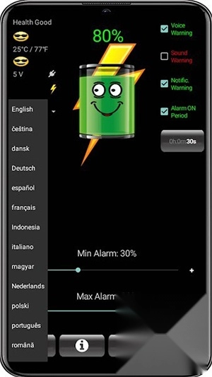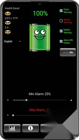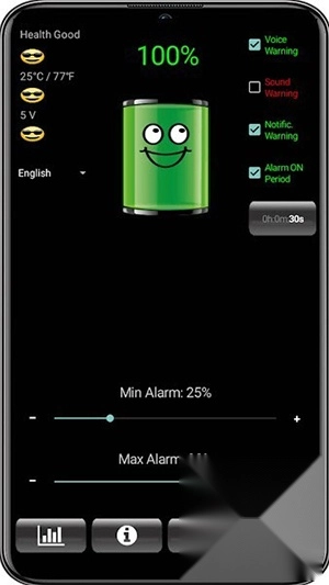 Battery Alarm PRO的中文名称是电池警报器,这是一款能够实时监控手机电池状态的电池管理工具。打开BatteryAlarmPRO的首页后,系统会自动检测手机的电池信息,像剩余电量、电压、电池温度等数据都会呈现出来。用户可以根据自身需求,选择设置语音警告、通知警告等不同的提醒模式,并且还能手动调整电池警报的最小和最大值。