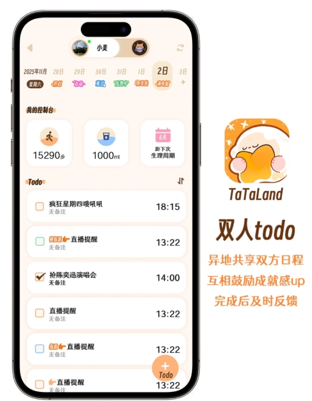 TaTaLand是一款专为情侣打造的健康管理互动软件,情侣双方可携手完成待办任务解锁专属成就,还能用健康行为喂养两人共同的虚拟宠物。软件采用温暖的游戏化设计,核心功能聚焦双人互动与健康共管,支持双人喝水提醒、生理期同步、步数统计、情绪打卡及状态记录,助力情侣一同关注彼此健康。此外,软件还支持向对方指派任务、设置专属提醒音与震动提醒,以及共享日程安排,尤其适合异地恋情侣维持日常互动!