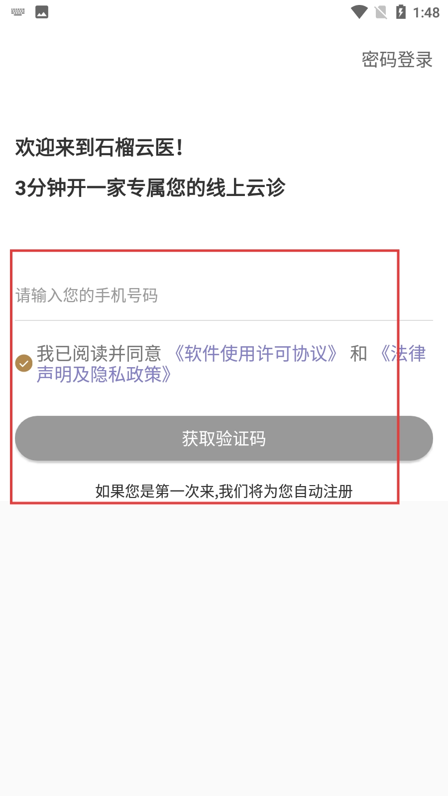 2、在登录页面输入号码,勾选同意协议后点击【获取验证码】按钮。
