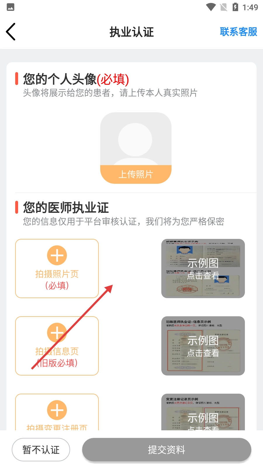 4、登录系统后进入执业认证界面,需上传个人头像照片与医师执业证照片,完成上述操作后即可提交资料申请认证。