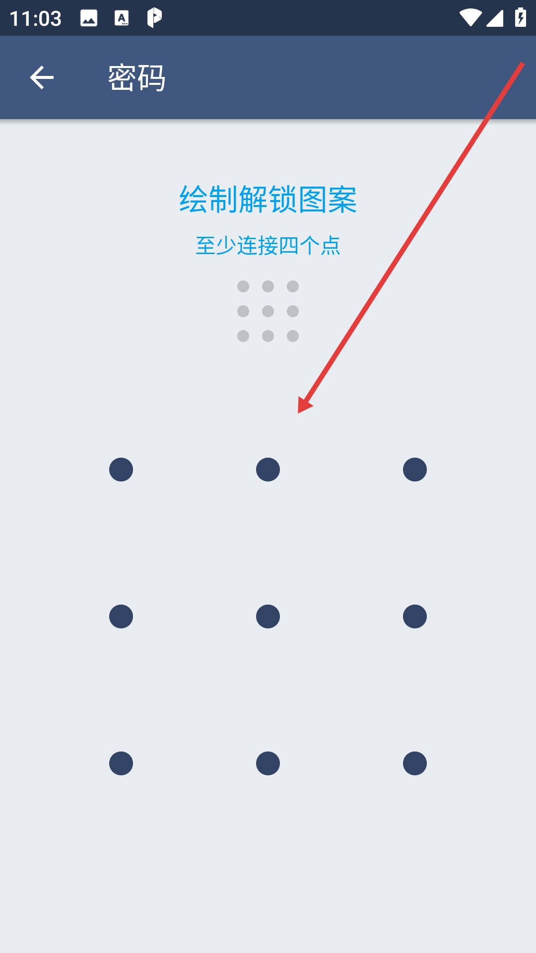 4、在解锁图案绘制页面,绘制一个至少连接四个点的解锁图案,以此完成手势密码的设置步骤。