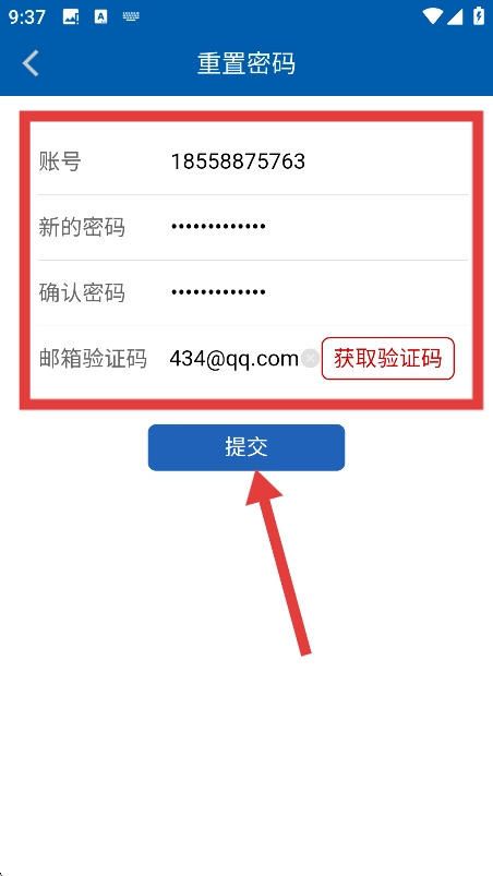 进入重置密码页面后,依次填写【账号】、【新密码】、【确认密码】,获取并填写【邮箱验证码】,最后点击【提交】按钮,即可完成密码重置操作。