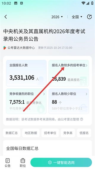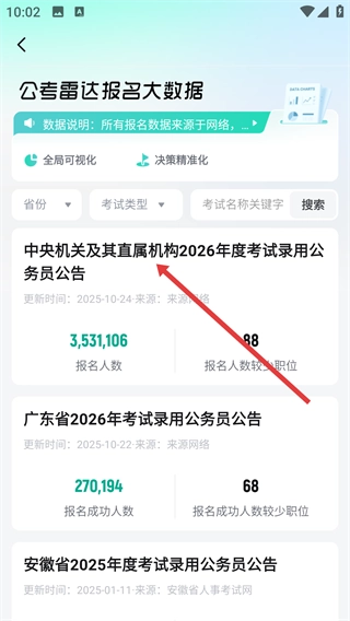 2、在【公考雷达报名大数据】页面,能够查看各类公考的报名数据,例如【中央机关及其直属机构2026年度考试录用公务员公告】的报名详情。