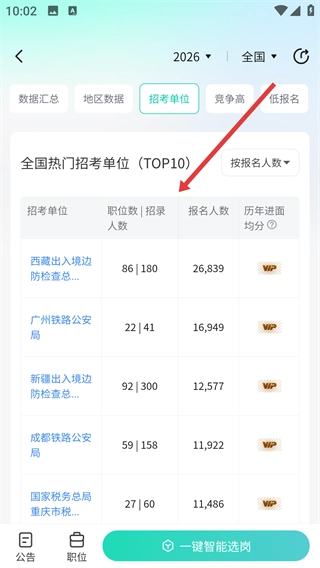 4、进入热门招考单位页面后,能够查看【全国热门招考单位(TOP10)】的职位数量、报名人数等具体数据,这些信息可以帮助用户进行选岗决策。