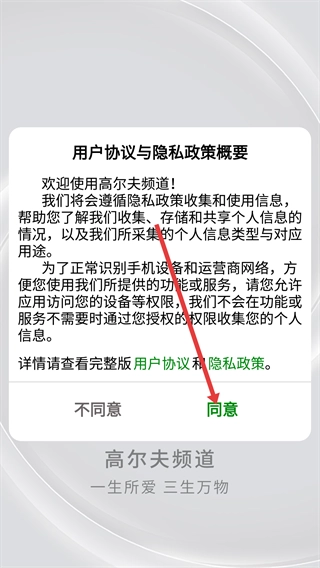 在使用高尔夫频道前,您需要先阅读《用户协议与隐私政策概要》,在了解信息收集及权限使用规则后,点击“同意”按钮,才能正常使用软件的各项功能。
