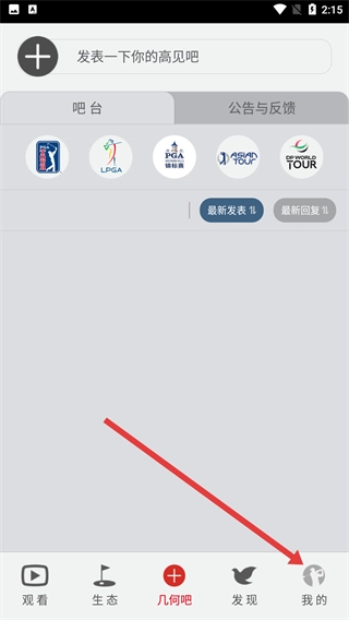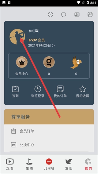 2、进入高尔夫频道主界面后,点击底部的【我的】选项,就能进入个人中心页面,在这里可以查看会员、订单等与个人相关的功能。