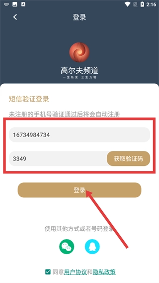 4、在登录界面,选择短信验证登录方式,输入手机号和收到的验证码,点击【登录】按钮就能完成登录;若手机号未注册,验证通过后系统会自动完成注册流程。