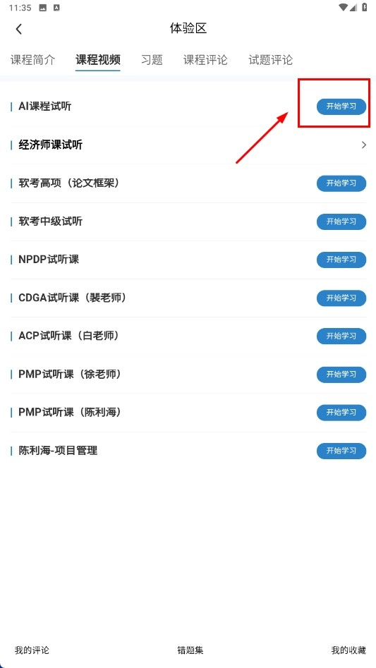 在体验区页面,点击【课程视频-功能选项】,查看可试听课程列表。