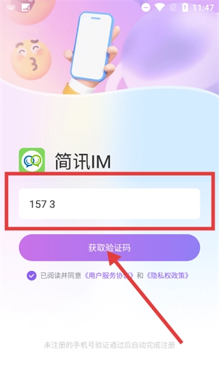 在简讯IM的手机号验证界面,输入手机号码后,点击【获取验证码】按钮,即可完成账号注册或登录的验证步骤。