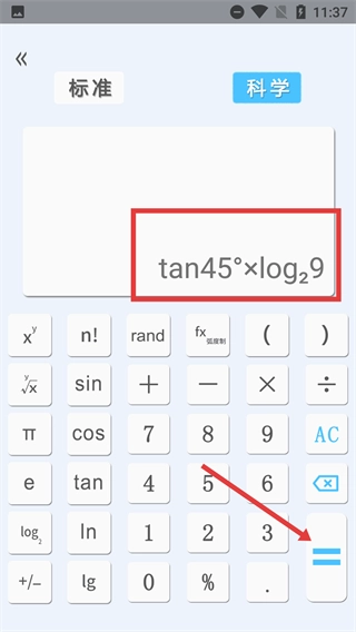 在科学计算器的操作界面中,输入需要进行运算的数学式子,像“tan45°×log₂9”这样的例子就可以。