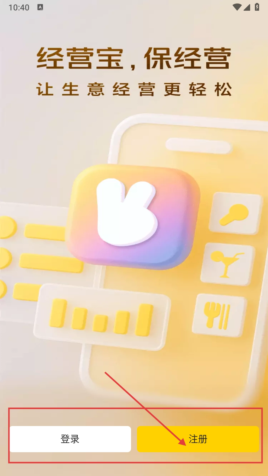 1、启动经营宝应用后,找到并点击【注册】按钮,即可进入注册环节。