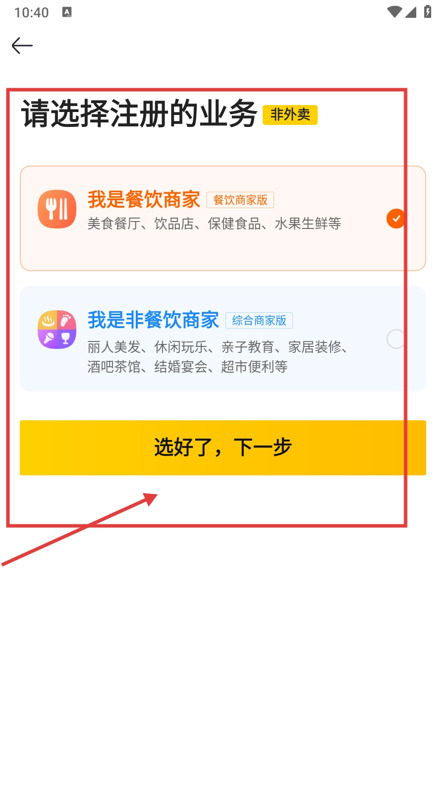 2、进入注册业务选择界面后,选择【我是餐饮商家】这一选项,接着点击【选好了,下一步】按钮。