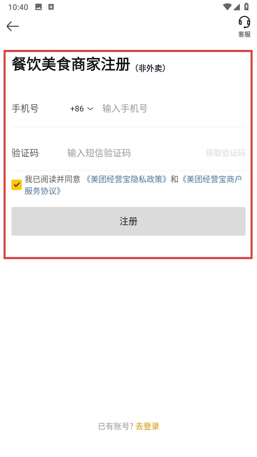 3、在餐饮美食商家的注册界面,输入号码,并勾选同意相关协议。