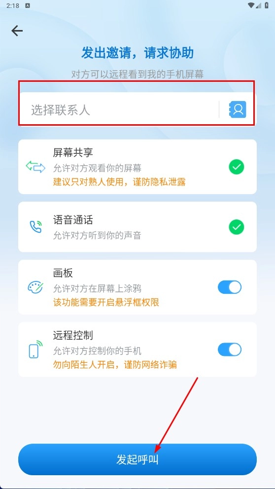 3、进入请求协助页面后,先选择对应的联系人,接着对屏幕共享、语音通话等功能进行设置,完成后点击【发起呼叫】功能按钮。
