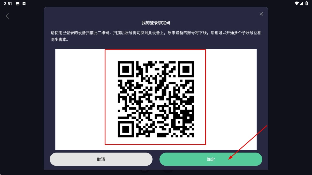 3、若选择二维码登录方式,扫描二维码后点击【确定】功能按钮,即可完成账号绑定操作。