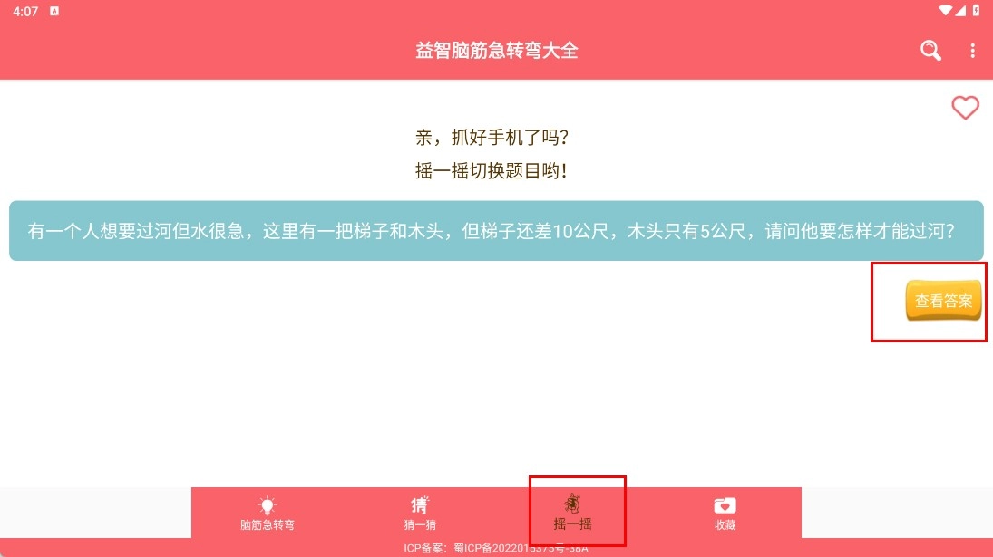 在【摇一摇模块】中,晃动手机即可切换题目,点击【查看答案按钮】就能查看答案。