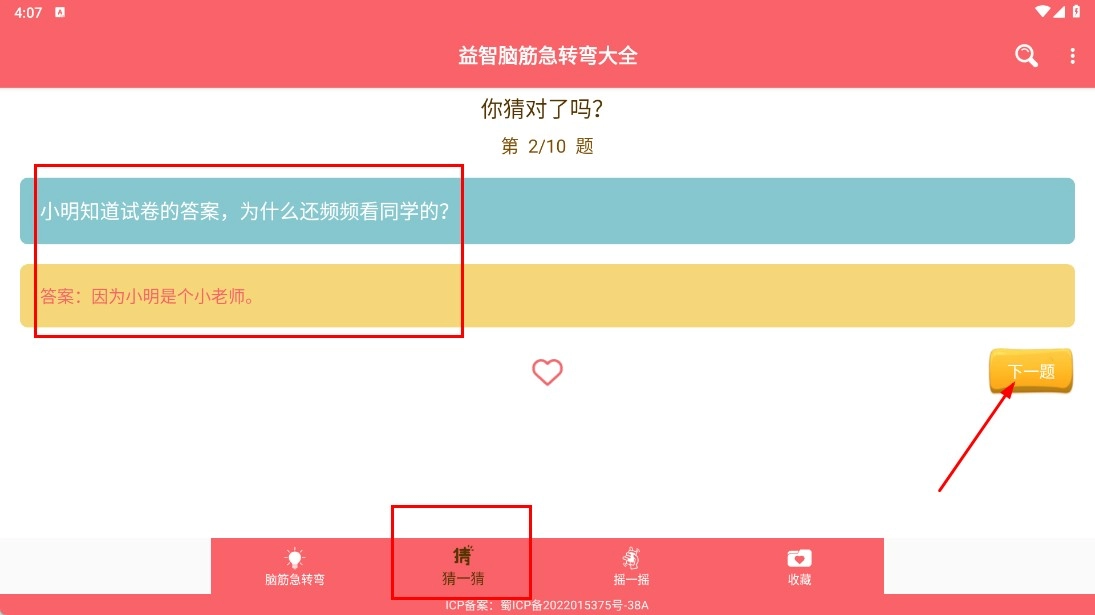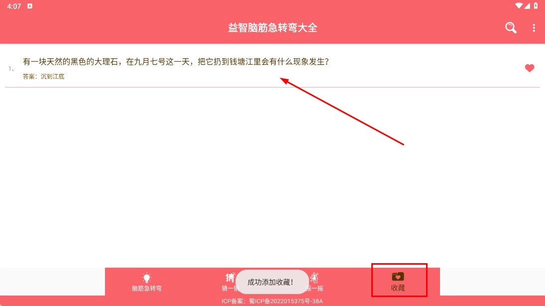 点击【脑筋急转弯-功能入口】,浏览脑筋急转弯的题目和答案时,可对其进行收藏操作。