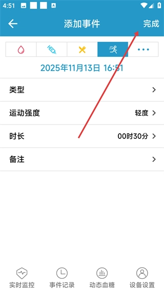 在添加事件的页面中填写好事件相关信息后,点击【完成】按钮,即可保存该事件记录。
