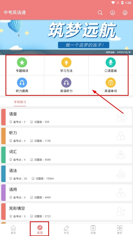 点击底部的【发现-功能按钮】,就能选择专题精讲、学习方法等功能模块进行使用。