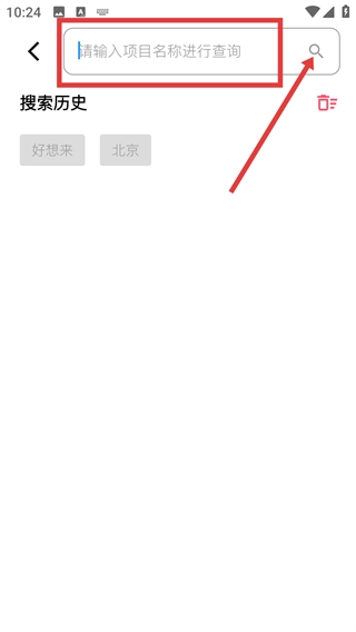 在搜索页面的输入框里填入项目名称,接着点击右边的搜索图标,就能开展项目查询的操作了。