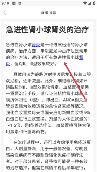 进入具体文章后,能查看【急进性肾小球肾炎的治疗】的详细知识,涵盖甲泼尼龙冲击疗法、血浆置换等治疗手段。