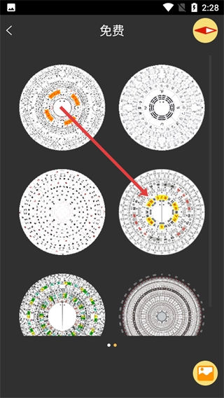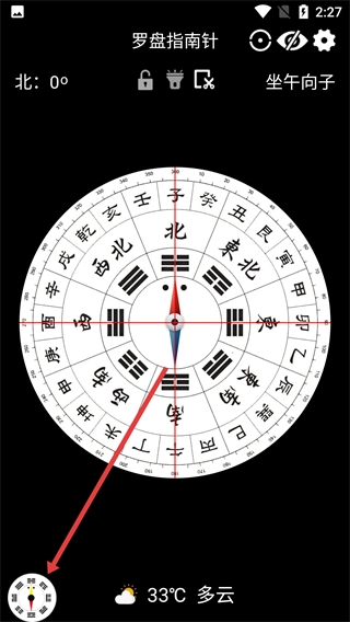 2、在【罗盘指南针-界面】里,点击左下角的小罗盘图标,就能进入罗盘样式选择页面。
