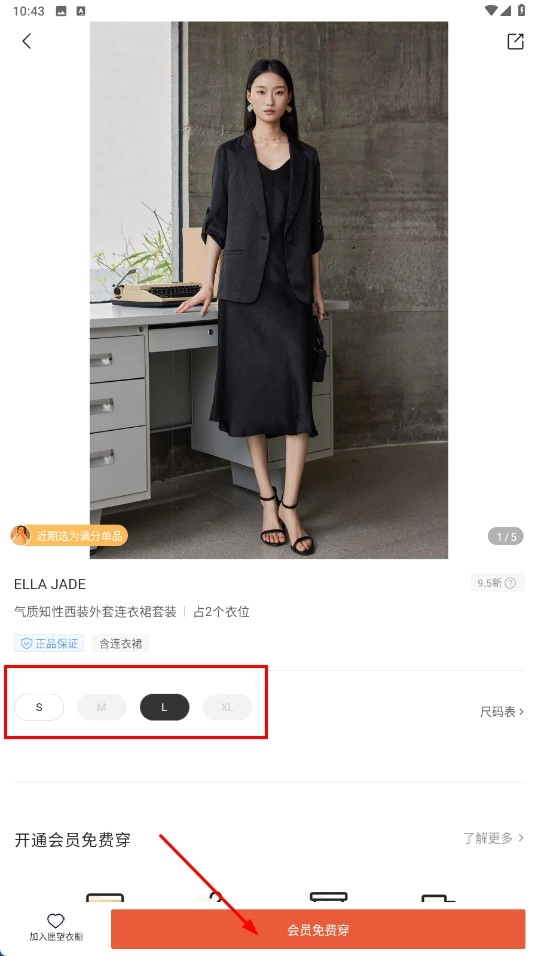 4、在服饰详情页面,挑选好合适的尺码后,点击【会员穿】功能按钮即可进行租赁操作。