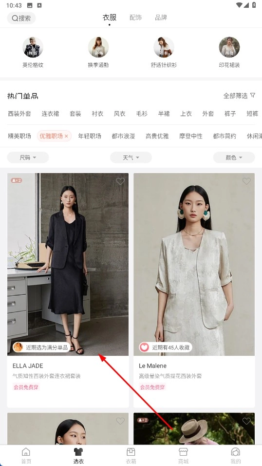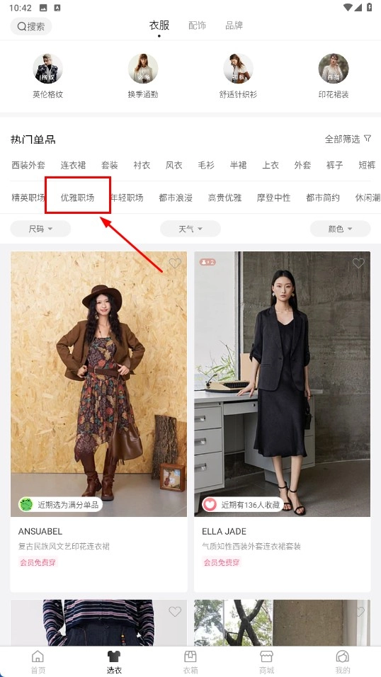 在选衣页面,选择【优雅职场-风格标签】,筛选出对应风格的服饰。