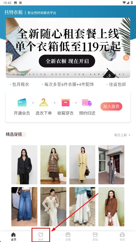 1、点击底部【选衣-功能按钮】,进入选衣页面。