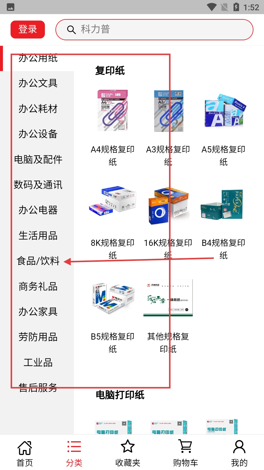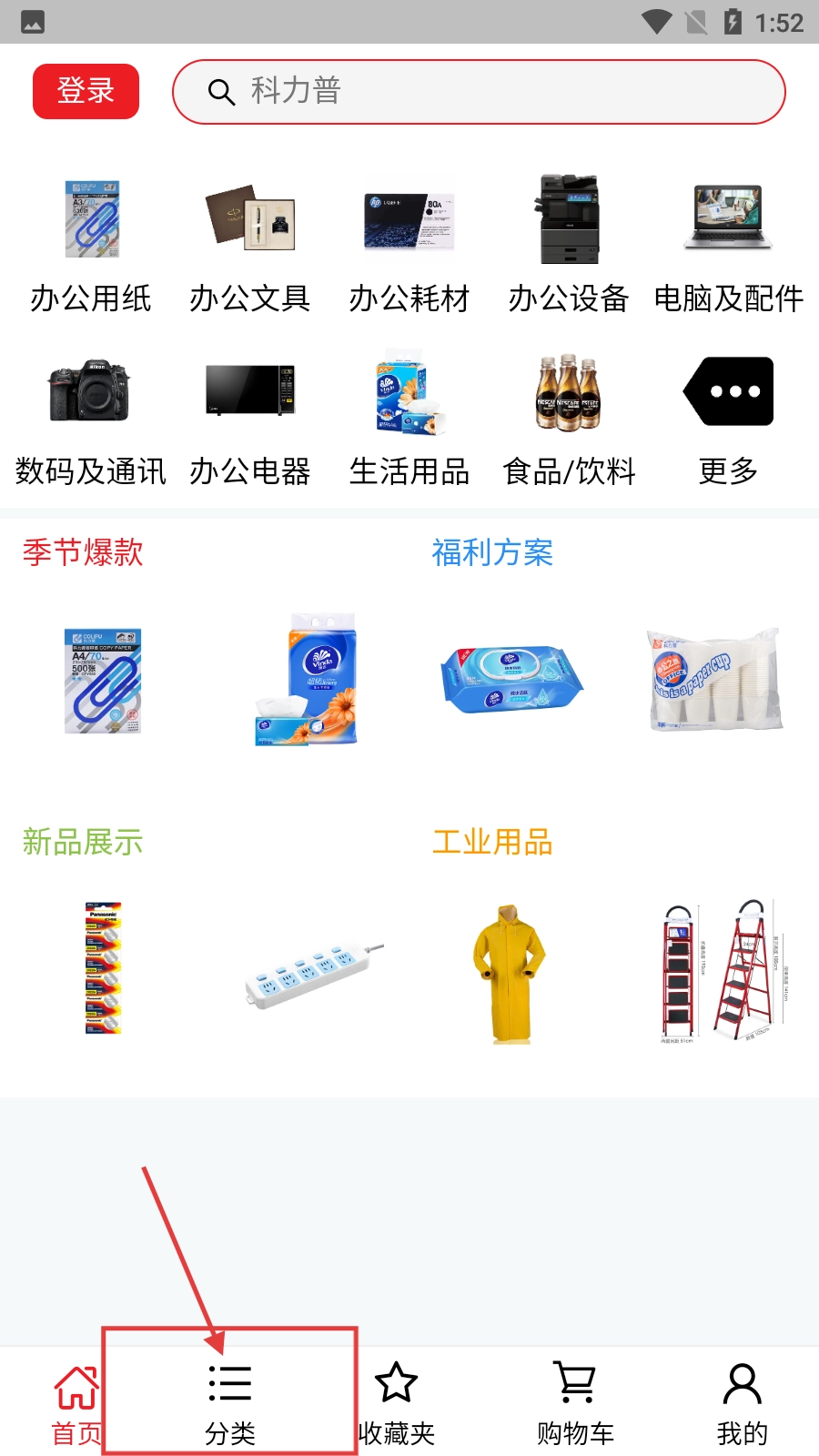 1、打开科力普首页后,点击页面底部的【分类】按钮,即可进入商品分类页面,在这里可以浏览办公用纸、文具等不同类别的商品分类。