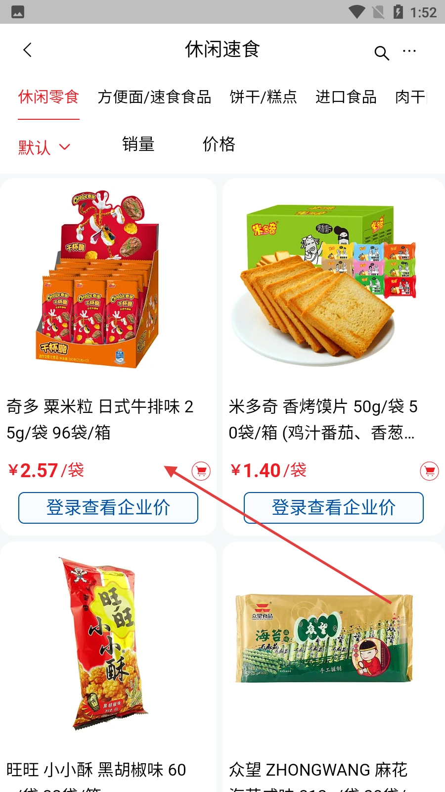 3、进入【休闲速食-休闲零食】页面,浏览商品列表后挑选自己喜欢的零食,像奇多粟米粒这类都可以。
