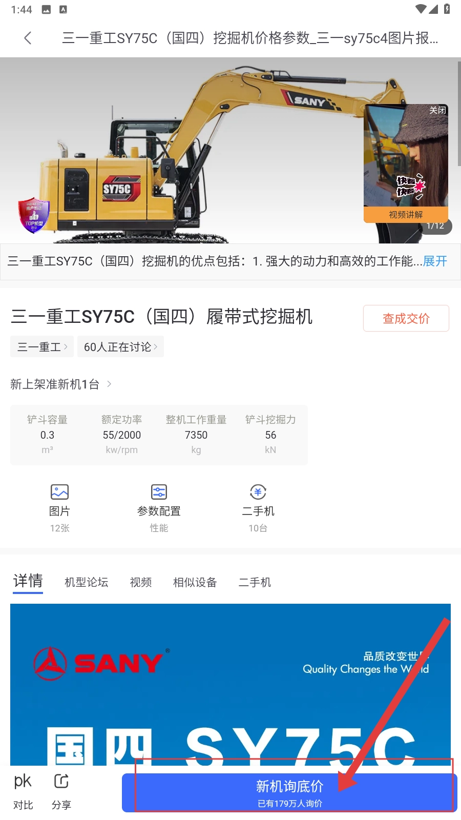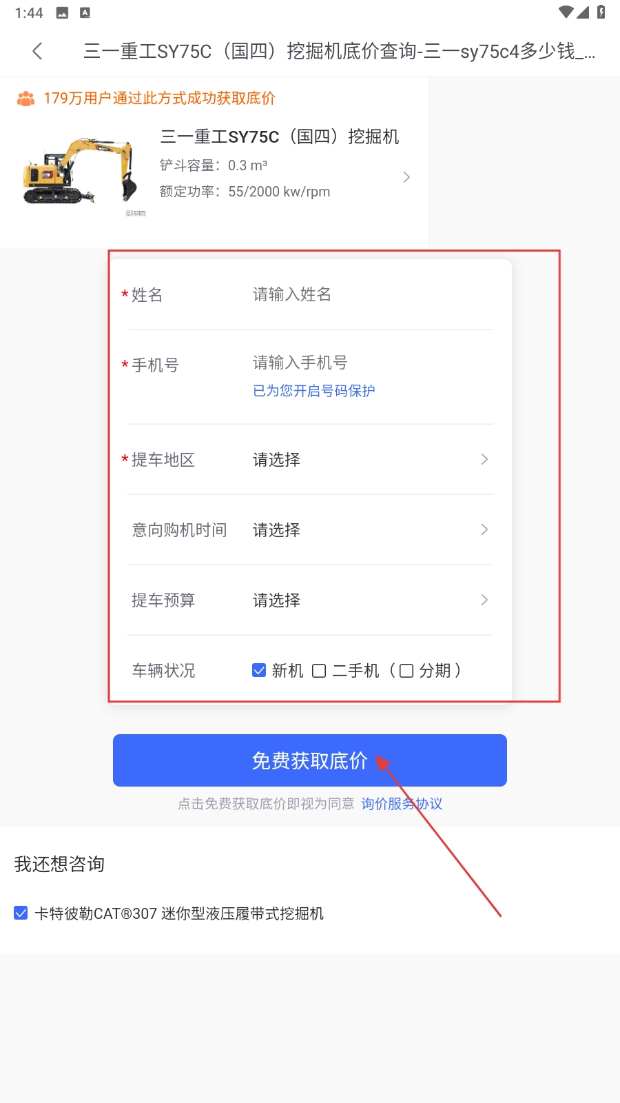 3、进入具体的挖掘机详情页面后,点击【新机询底价】功能按钮,即可进入询价页面。