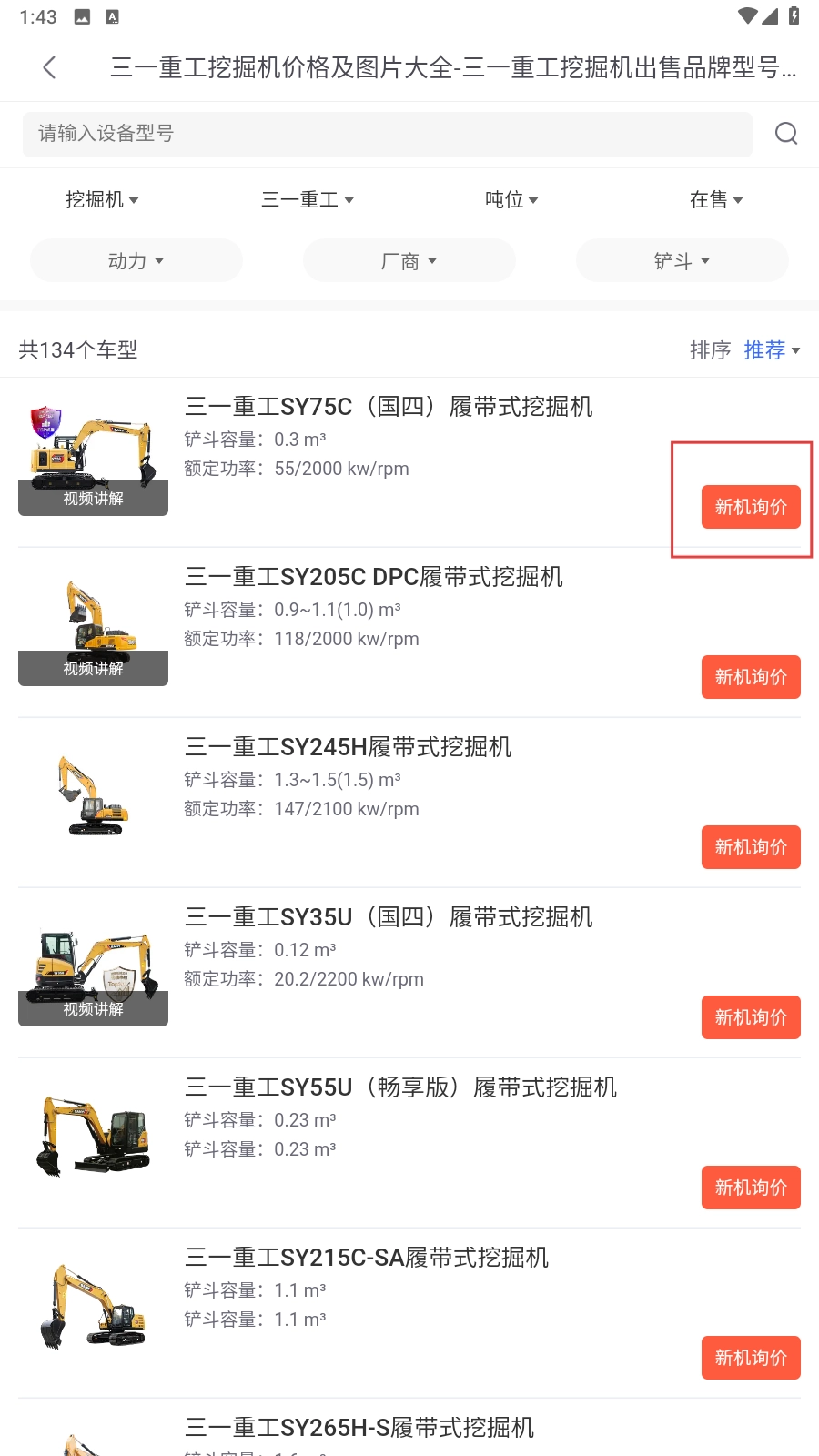 2、进入三一重工挖掘机列表页面后,能够查看多种挖掘机型号,接着点击【新机询价】功能按钮。
