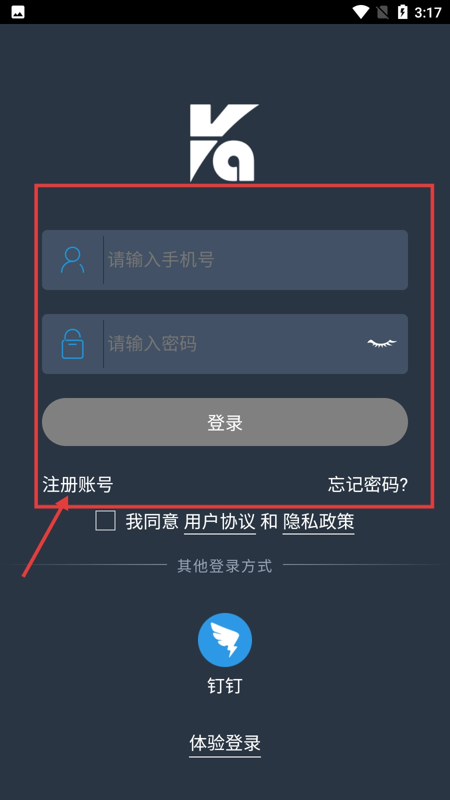 3、在登录界面,点击【注册账号】,进入注册页面。